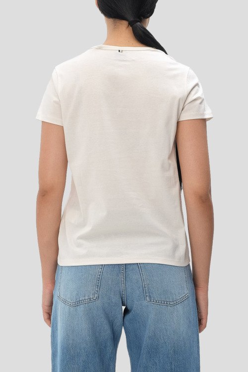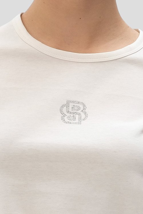 Детали: Женская хлопковая футболка молочного оттенка Eventsa от Hugo Boss (Хуго Босс). Логотип из кристаллов на груди, круглый вырез горловины, короткий рукав, классическая длина