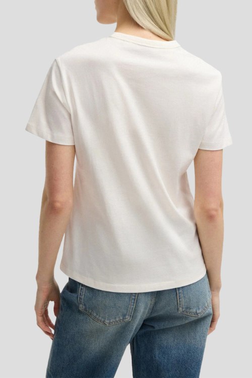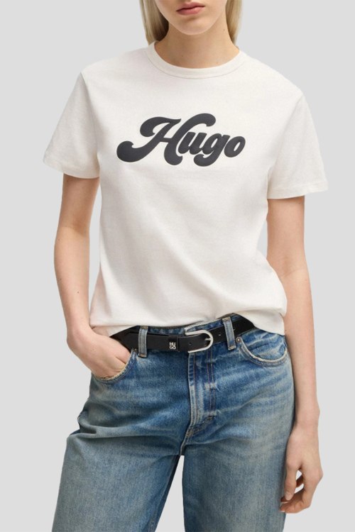 Детали: Женская кремовая хлопковая футболка Damacia от Hugo by Hugo Boss (Хуго бай Хуго Босс). Логотип на груди, круглый вырез горловины, короткий рукав, классическая длина