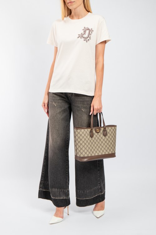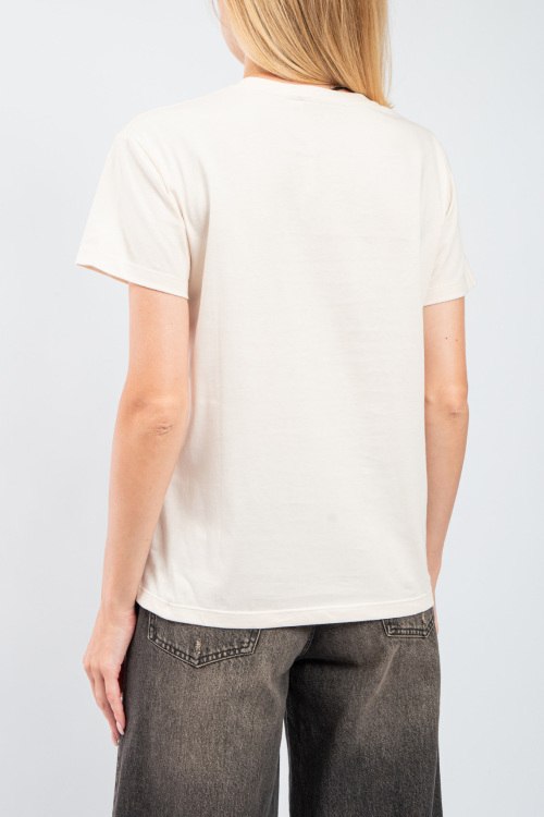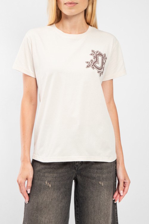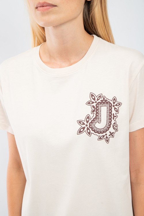Женская хлопковая футболка молочного оттенка от J.B4 Just Before (Джаст Бифо). Принт на груди, круглый вырез горловины, короткий рукав, классическая длина.