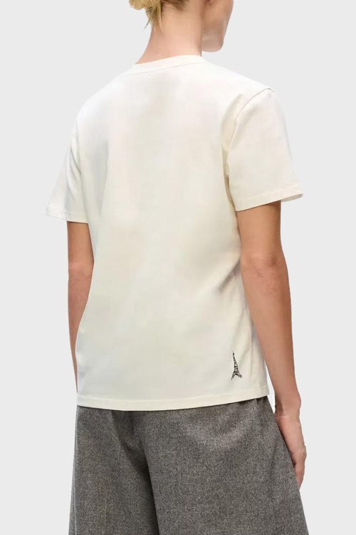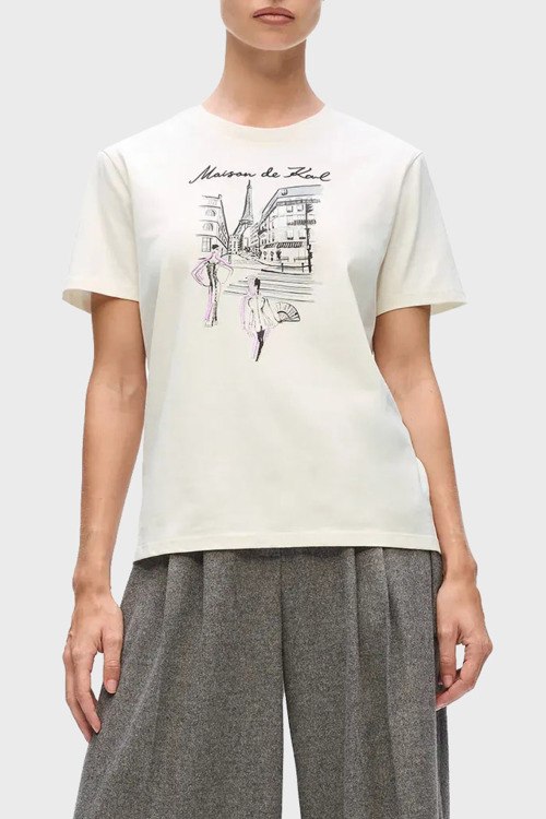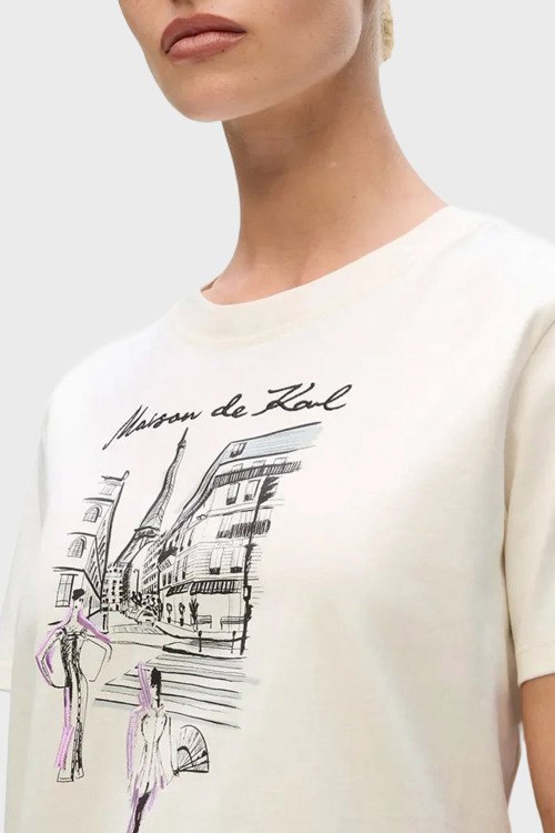 Детали: Женская кремовая хлопковая футболка Paris Sketch от Karl Lagerfeld (Карл Лагерфельд). Принт на груди, круглый вырез горловины, короткий рукав, классическая длина