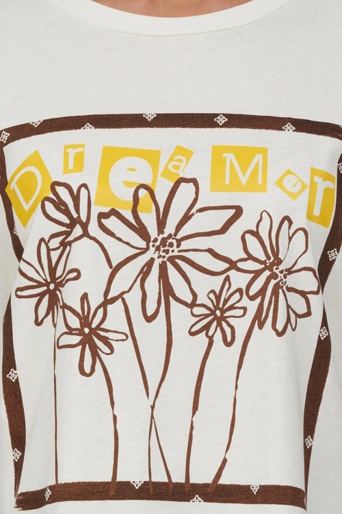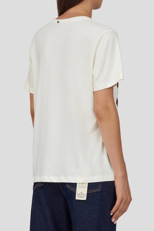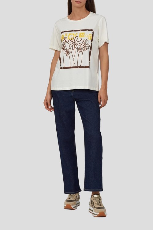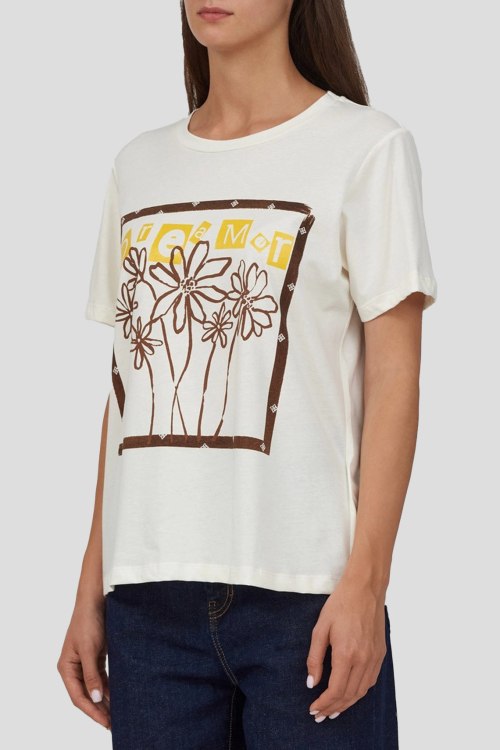 Детали: Женская футболка молочного оттенка из хлопка от Marina Rinaldi (Марина Ринальди). Круглый вырез горловины, короткие рукава, декорирована принтом