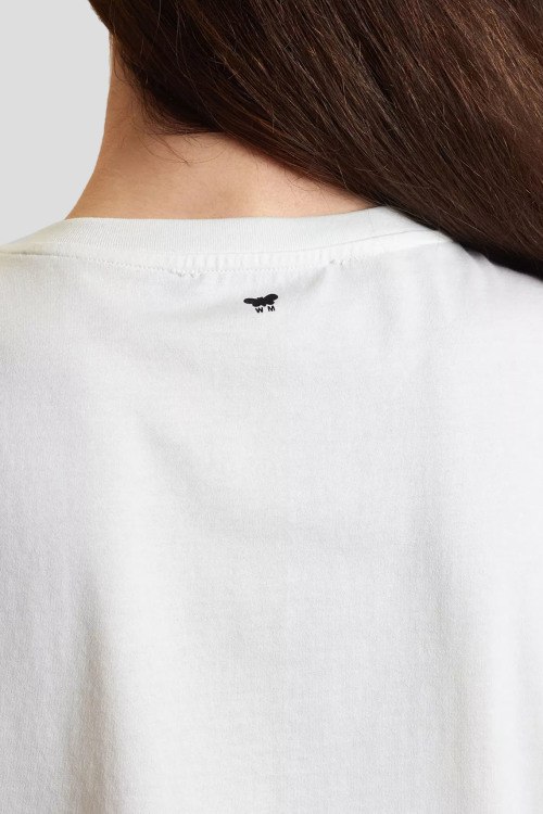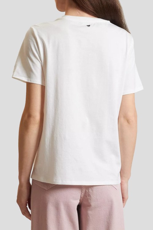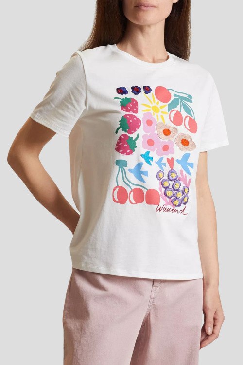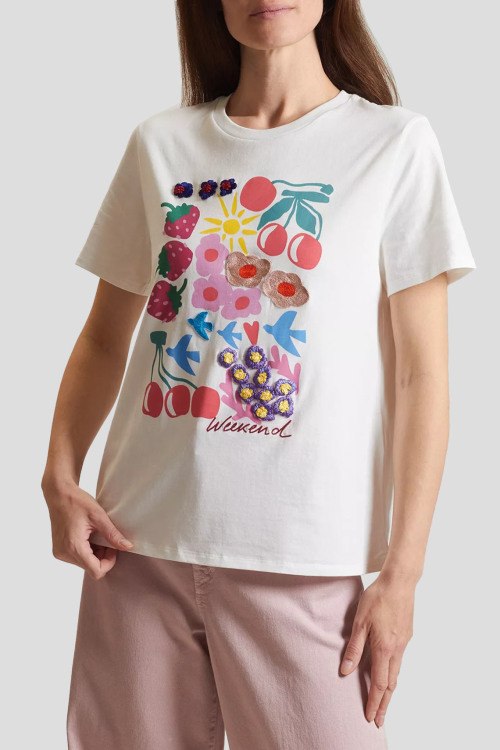 Детали: Женская футболка молочного оттенка из хлопка от Max Mara (Макс Мара). Круглый вырез горловины, короткие рукава, декорирована принтом и вышивкой