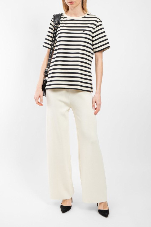 Женская черно-белая футболка из хлопка от Max Mara (Макс Мара). Классическая длина, круглый вырез горловины, дизайн в полоску, короткие рукава, вышитый логотип бренда, по бокам разрезы.