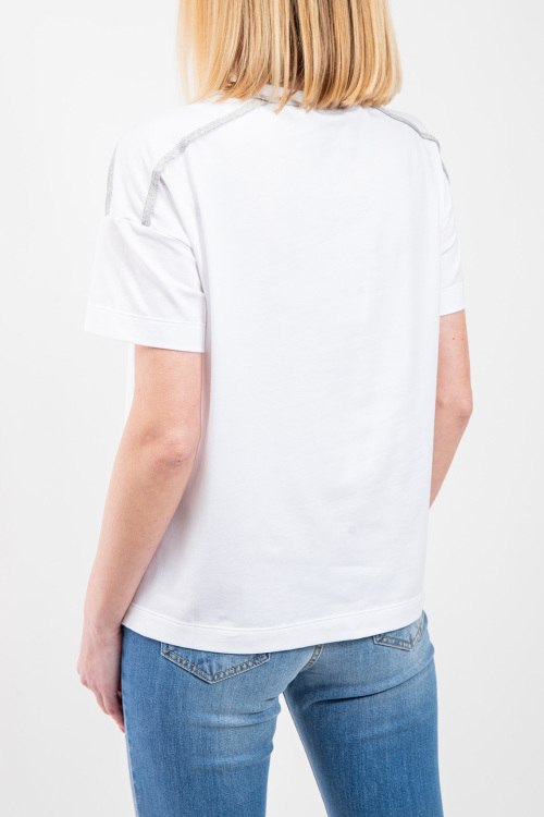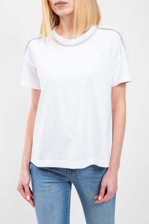 Женская белая футболка из хлопкового микса от Panicale Cashmere (Паникале Кашемир). Классическая длина, круглый вырез горловины, короткие рукава, контрастная окантовка. Замеры для размера 44: длина: 60 см, ширина по груди: 51 см, ширина по талии: 52 см, длина рукава по внутреннему шву: 8 см, ширина рукава: 18 см.