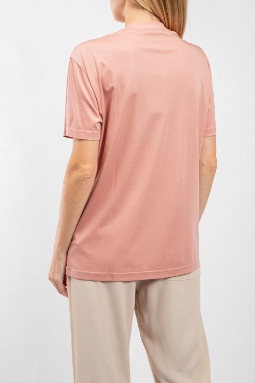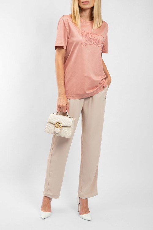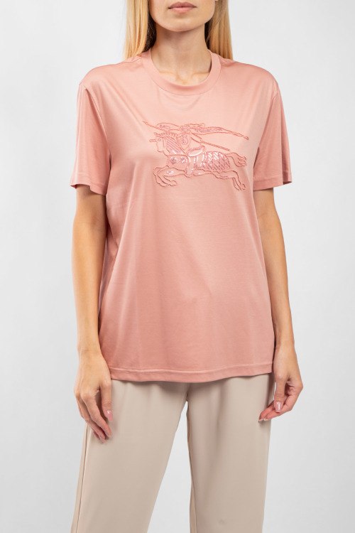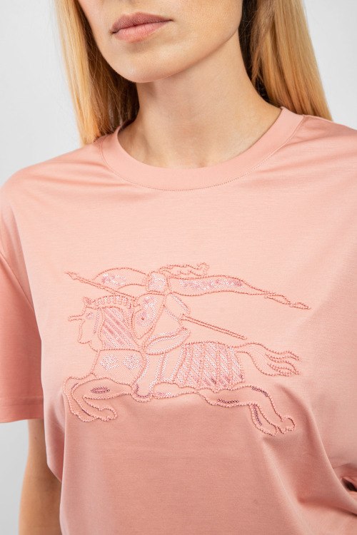 Детали: Женская пудровая футболка из хлопка от Burberry (Бёрберри). Прямой фасон, классическая длина, короткие рукава, круглый вырез горловины, спереди декорирована вышивкой и пайетками
