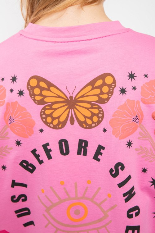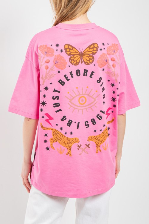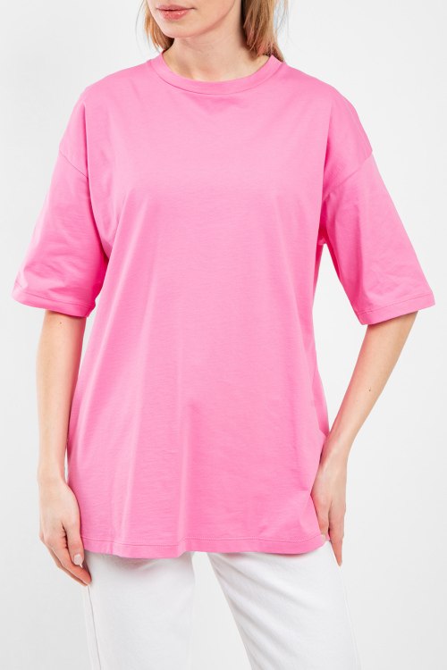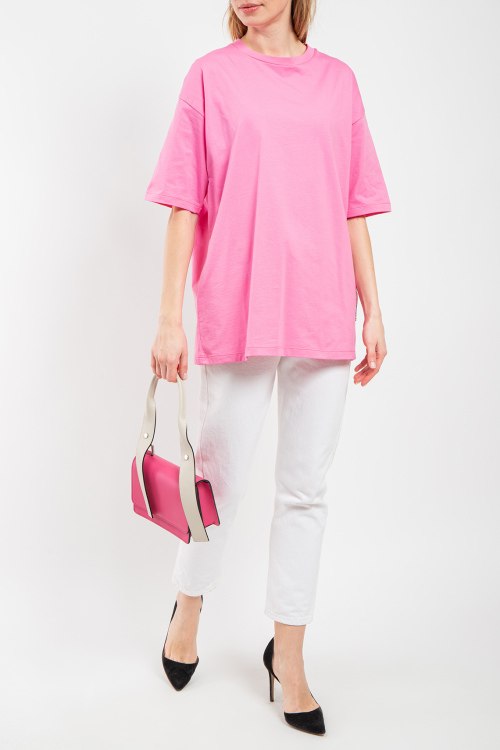 Женская розовая футболка из хлопка от J.B4 Just Before (Джаст Бифо). Модель oversize, круглый вырез горловины, короткие рукава, приспущенная линия плеча, брендированный принт на спине.