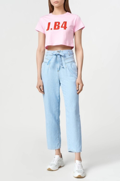 Детали: Женская розовая хлопковая укороченная футболка от J.B4 Just Before (Джаст Бифо). Логотип на груди, круглый вырез горловины, короткий рукав, укороченная длина