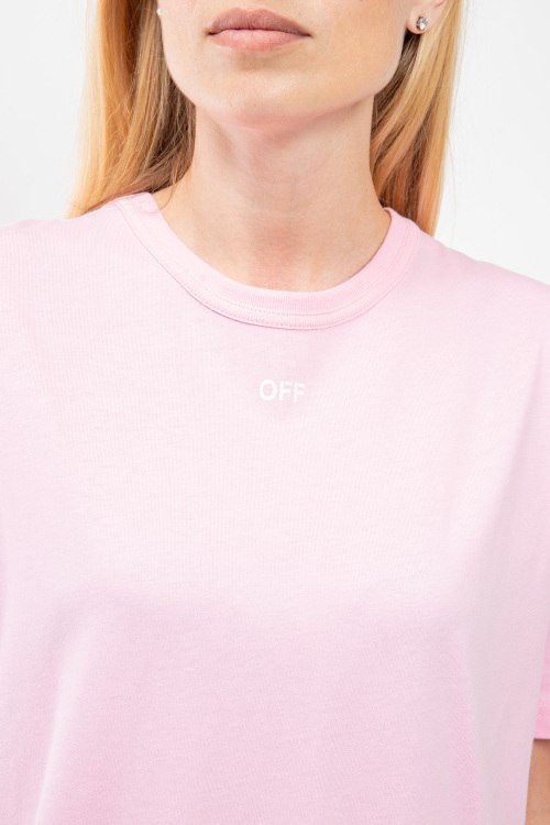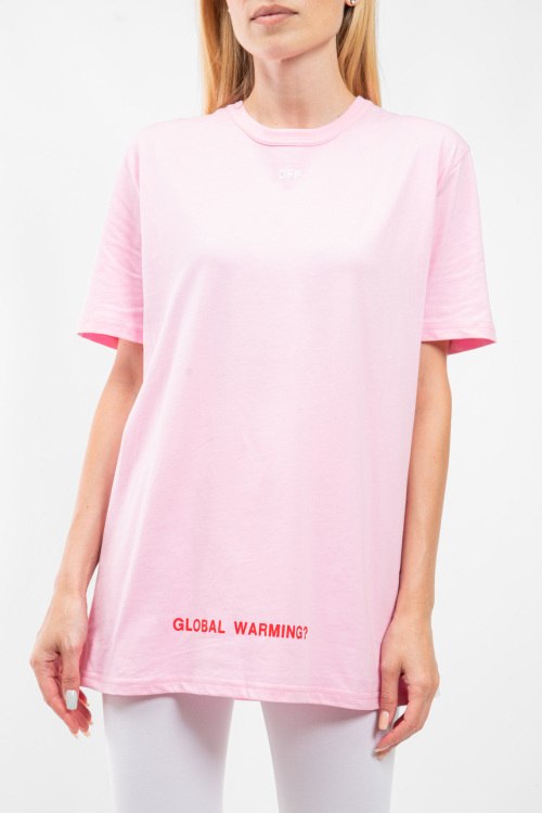 Женская розовая хлопковая футболка от Off-White (Офф-Вайт). Фасон oversize, принт спереди и сзади, круглый вырез горловины, короткий рукав, удлиненная длина.