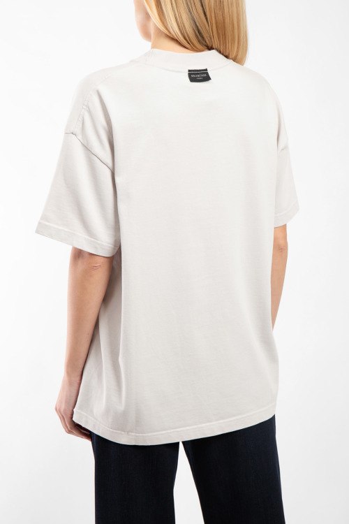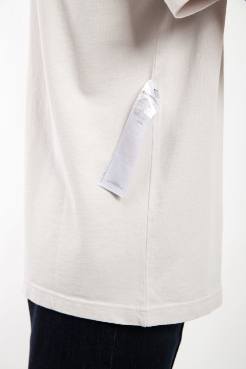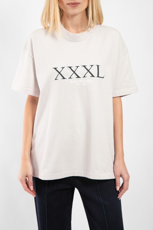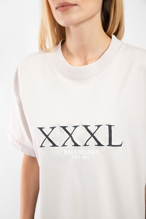 Светло-серая хлопковая футболка от Balenciaga (Баленсиага). Вышивка XXXL с логотипом на груди, круглый вырез горловины, короткий рукав, вшитая бирка сбоку с внешней стороны, бирка с логотипом сзади на кокетке, удлиненная длина.