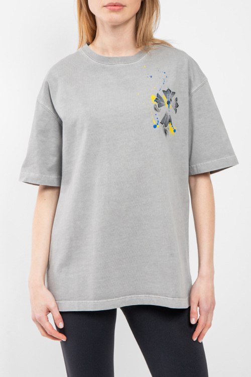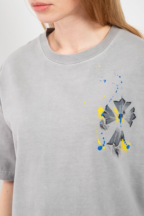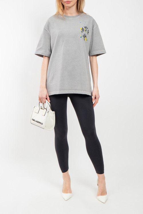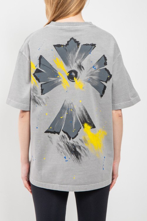 Женская серая хлопковая футболка от Chrome Hearts (Хром Хартс). Принт на груди и на спине, круглый вырез горловины, короткий рукав, удлиненная длина.