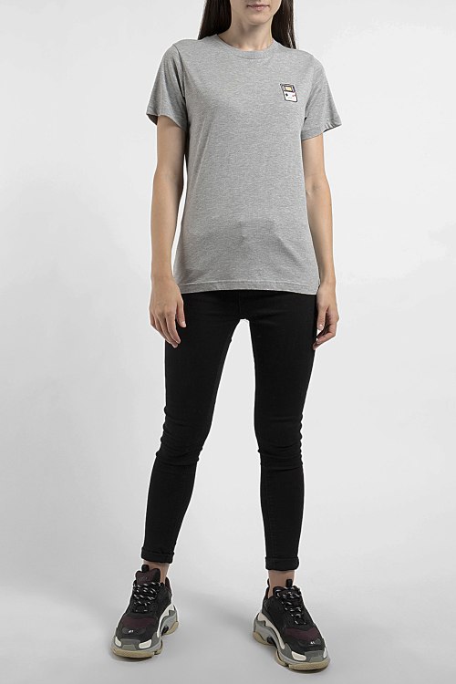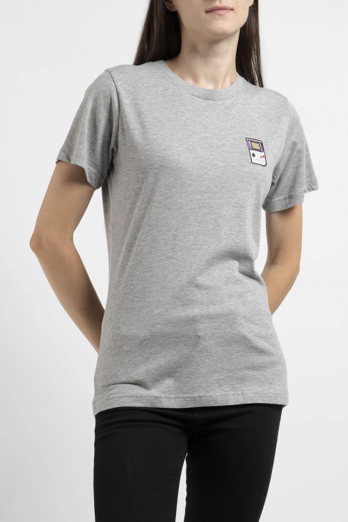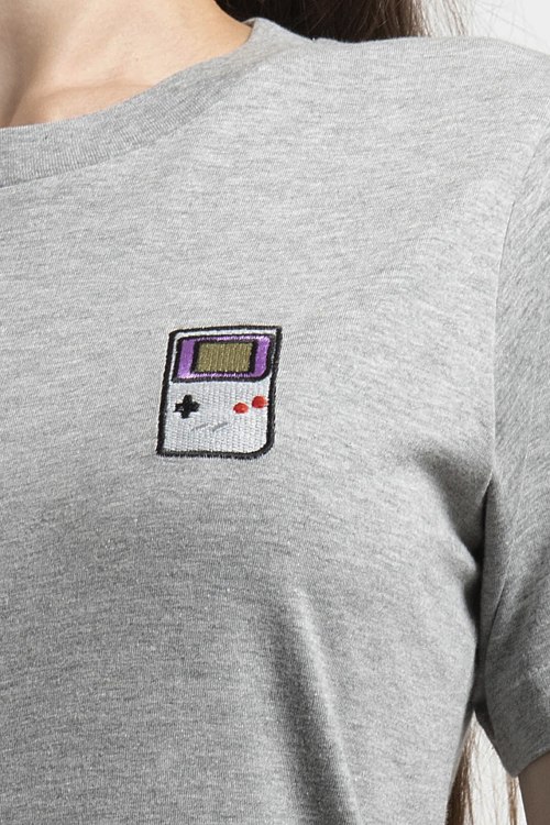 Женская серая футболка из хлопка от Ko Samui (Ко Самуи). Спереди вышивка Game Boy. круглый вырез горловины, короткие рукава, ровный низ изделия.