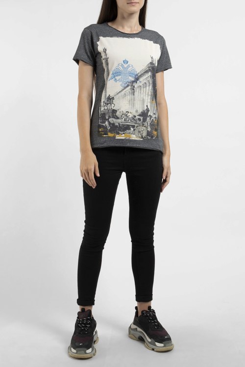 Женская темно-серая футболка из хлопка от Ko Samui (Ко Самуи). Спереди принт Empire, короткие рукава, круглый вырез горловины, ровный подол, необработанные края.