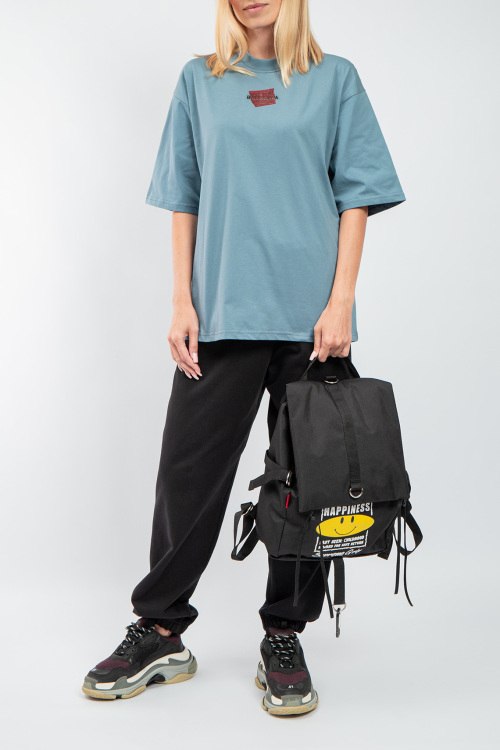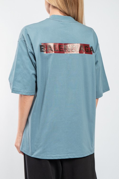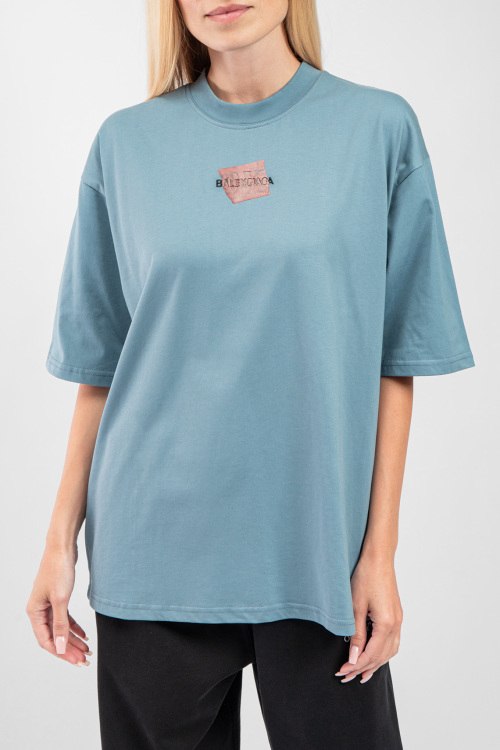 Детали: Женская синяя хлопковая футболка от Balenciaga (Баленсиага). Фасон oversize, логотип на груди и на спине, круглый вырез горловины, короткий рукав, удлиненная длина