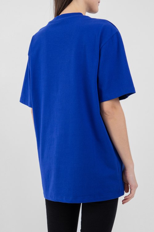 Женская синяя футболка из хлопка от Gucci (Гуччи). Удлиненная модель oversize, круглый вырез горловины, короткие рукава, ровный низ изделия, декор: спереди принт с фирменным логотипом бренда.