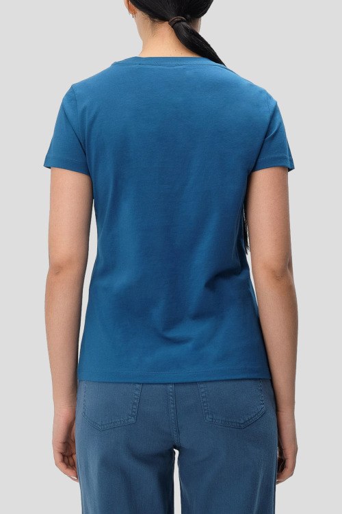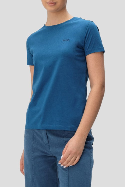 Детали: Женская синяя хлопковая футболка C_Esogo от Hugo Boss (Хуго Босс). Логотип на груди, круглый вырез горловины, короткий рукав, классическая длина
