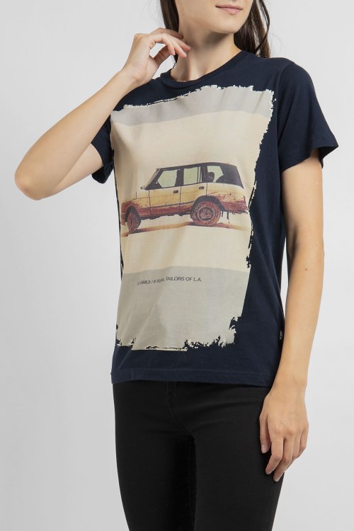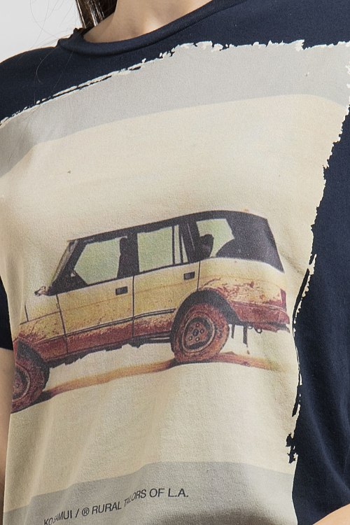 Женская темно-синяя футболка из хлопка от Ko Samui (Ко Самуи). Спереди принт Jeep, круглый вырез горловины, короткие рукава, ровный низ изделия.