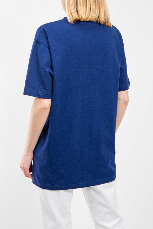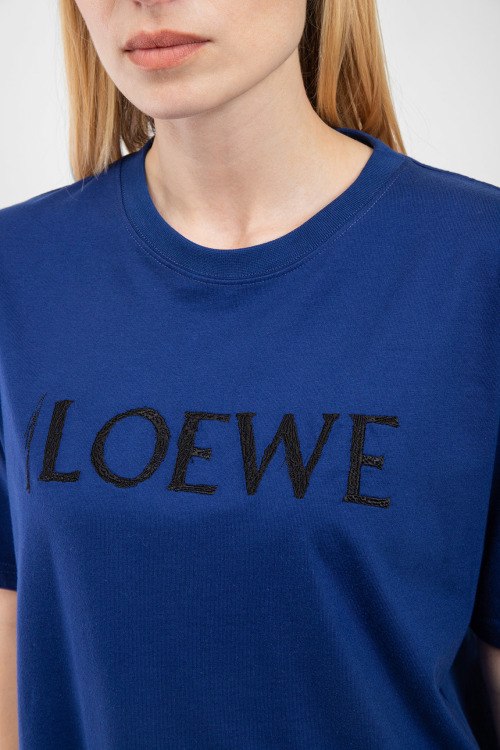 Женская темно-синяя футболка из хлопка от Loewe (Лоэйве). Фасон oversize, круглый вырез горловины, короткие рукава, вышитый логотип бренда на груди. Замеры для размера на фото: M; длина - 75 см; ПОГ - 56 см; ПОТ - 54,5 см; ПОБ - 54,5 см; длина по внутреннему шву рукава - 14,5 см; ширина рукава - 21 см.