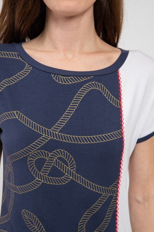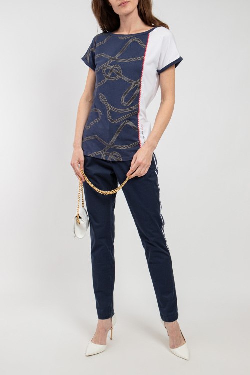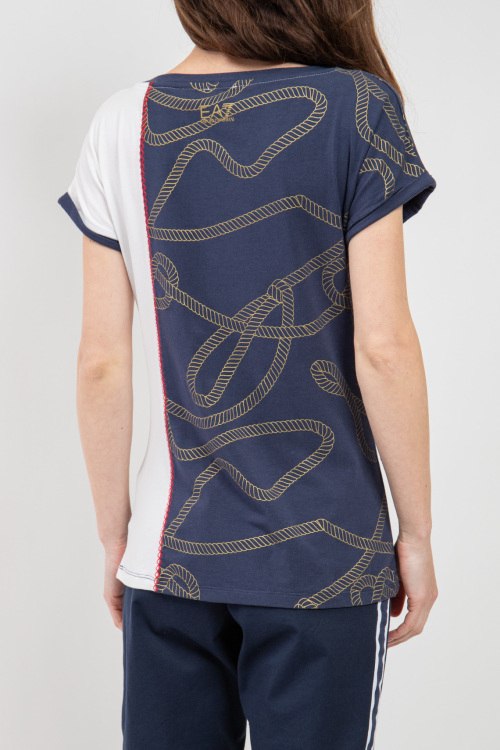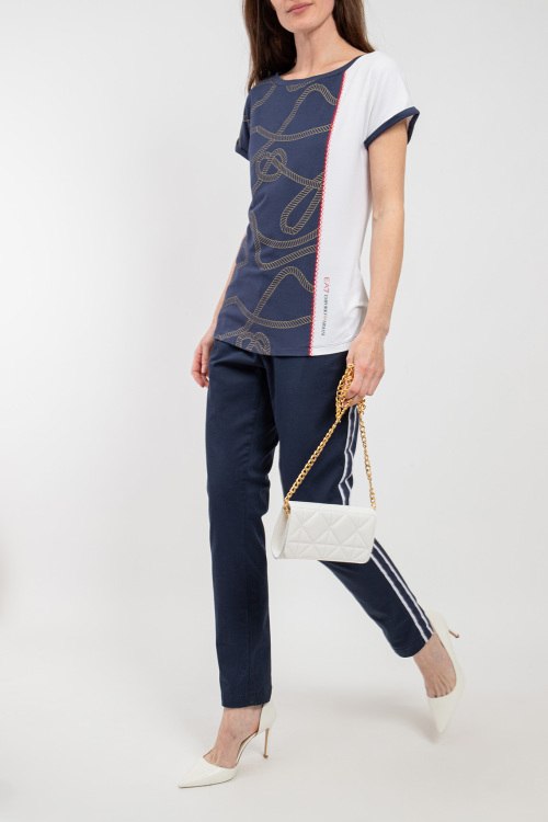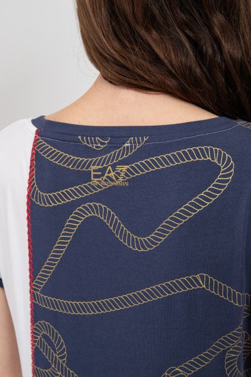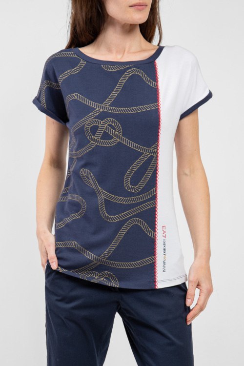 Женская синяя футболка из хлопка и модала от Armani (Армани). Классическая длина, круглый вырез горловины, короткие рукава, комбинация цветов, дизайн с принтом, логотип бренда.