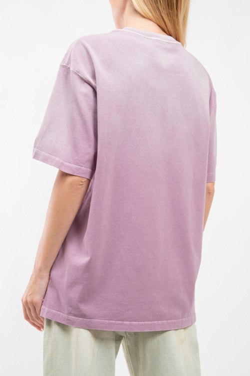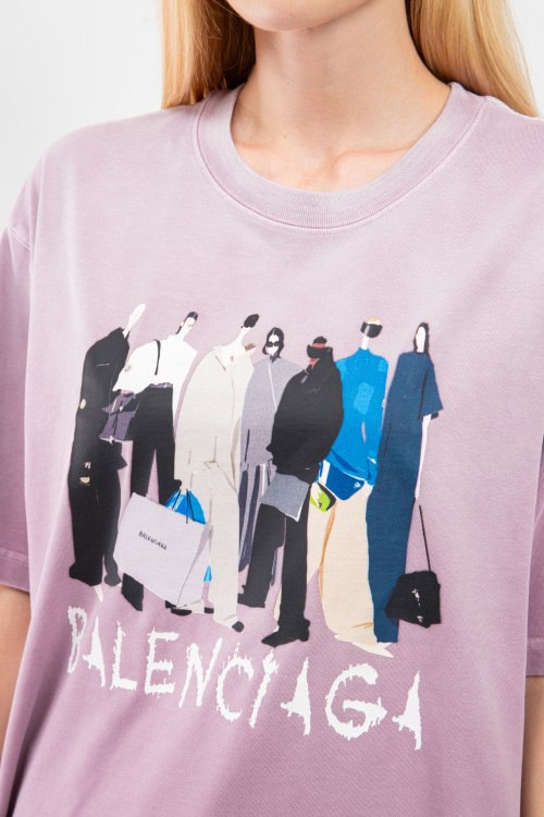 Женская сиреневая хлопковая футболка от Balenciaga (Баленсиага). Фасон oversize, принт на груди, круглый вырез горловины, короткий рукав, удлиненная длина.