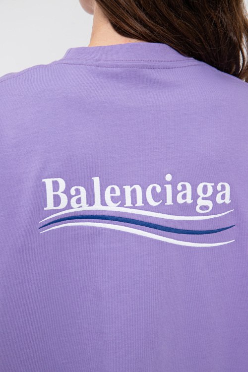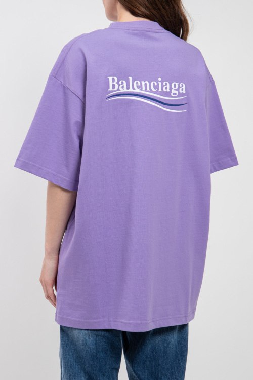 Женская сиреневая футболка из хлопка от Balenciaga (Баленсиага). Модель oversize, короткие рукава, круглый вырез под горло, ровный низ изделия, декор: фирменный логотип бренда на спине и на груди. Замеры на размер р.XXS: длина изделия - 81 см; плечи - 56 см; ПОГ - 60 см; ПОТ - 57 см; длина рукава от подмышки - 17 см; ширина рукава - 26 см; слегка тянется