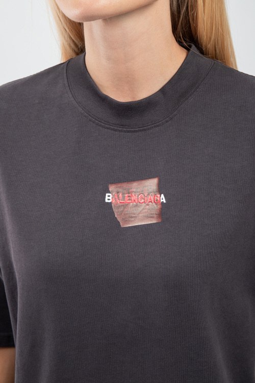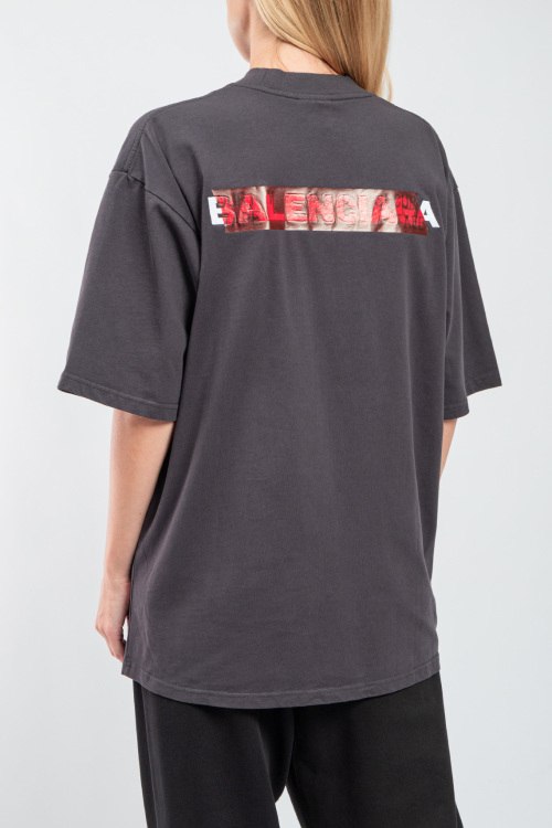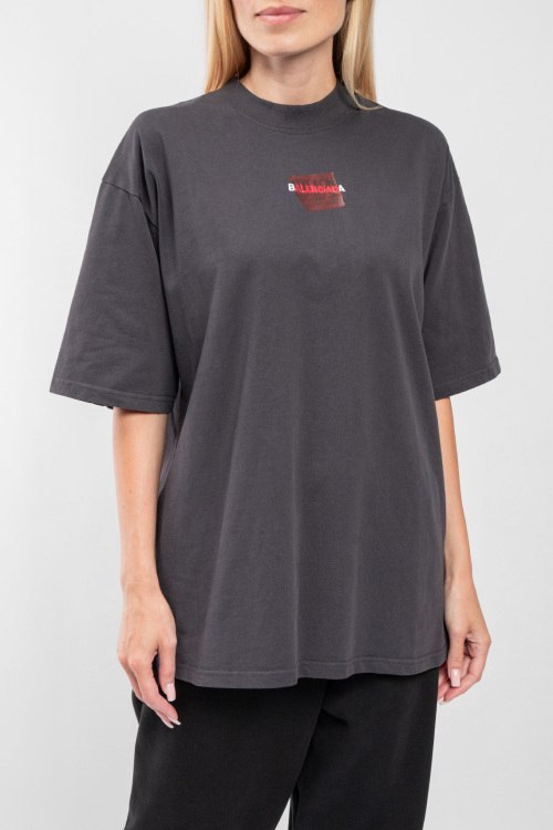 Детали: Женская темно-серая хлопковая футболка от Balenciaga (Баленсиага). Модель oversize, принт с логотипом спереди и сзади, круглый вырез горловины, короткий рукав, удлиненная длина