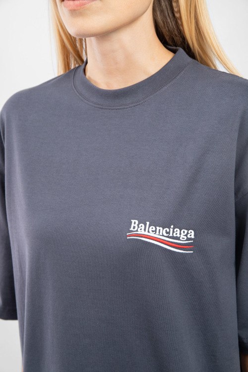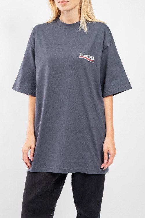 Женская темно-серая хлопковая футболка от Balenciaga (Баленсиага). Фасон oversize, логотип на груди и на спине, круглый вырез горловины, короткий рукав, удлиненная длина.