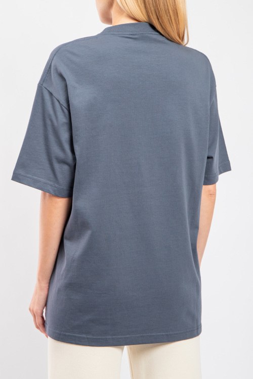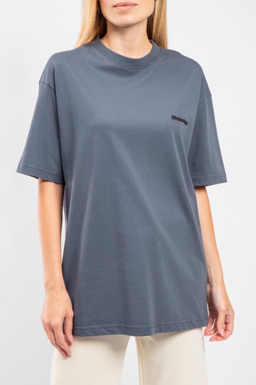 Женская темно-серая хлопковая футболка от Balenciaga (Баленсиага). Фасон oversize, логотип на груди, круглый вырез горловины, короткий рукав, удлиненная длина.