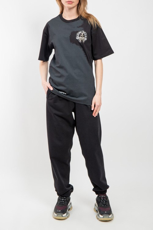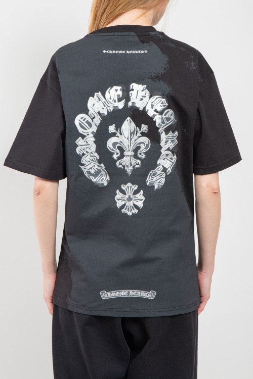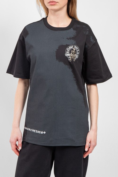Детали: Женская темно-серая хлопковая футболка от Chrome Hearts (Хром Хартс). Металлический логотип на груди, принт на спине, круглый вырез горловины, короткий рукав, удлиненная длина