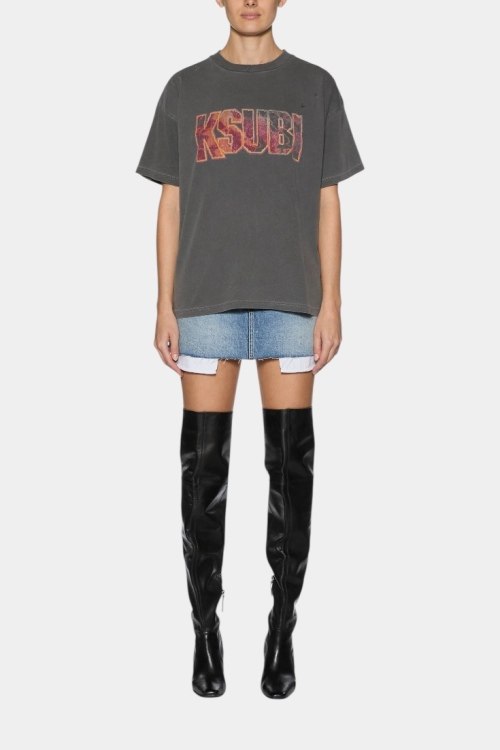 Детали: Женская темно-серая хлопковая футболка Kickstart от Ksubi (Ксуби). Принт с логотипом на груди, на спине принт и асимметричный вырез, круглый вырез горловины, короткий рукав, классическая длина