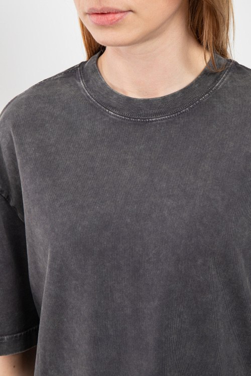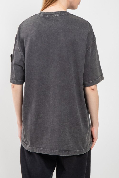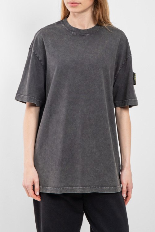 Женская темно-серая хлопковая футболка от Stone Island (Стоун Айленд). Логотип на рукаве, круглый вырез горловины, фасон oversize, короткий рукав, удлиненная длина.