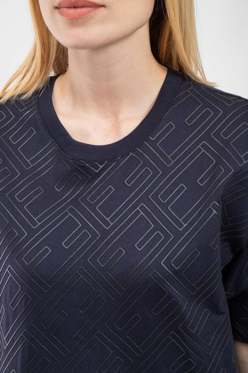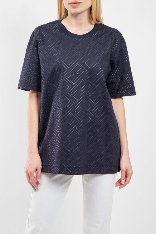 Женская темно-синяя футболка из хлопка от Fendi (Фенди). Фасон oversize, круглый вырез горловины, короткие рукава, дизайн с монограммой. Замеры для размера на фото: M; длина - 71 см; ПОГ - 55 см; ПОТ - 54 см; ПОБ - 55 см; длина по внутреннему шву рукава - 10 см; ширина рукава - 20,5 см.