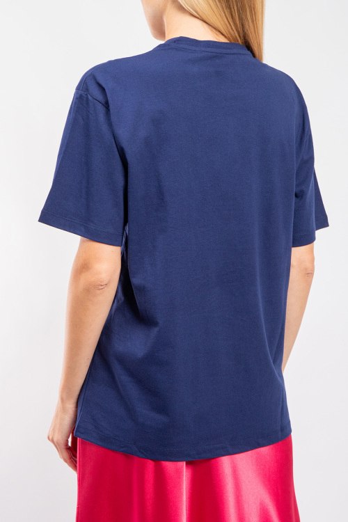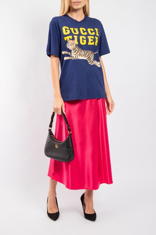 Женская темно-синяя хлопковая футболка Gucci Tiger от Gucci (Гуччи). Фасон oversize, логотип на груди, круглый вырез горловины, короткий рукав, удлиненная длина.