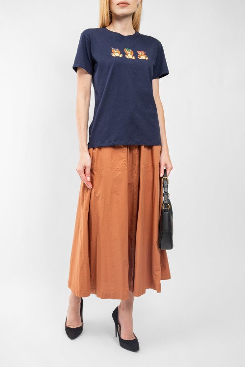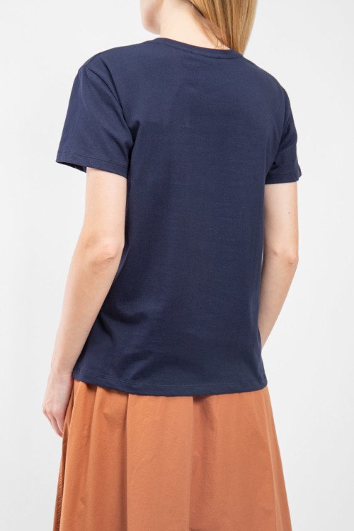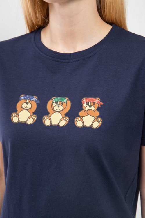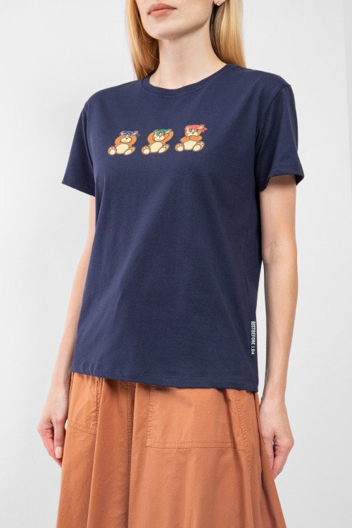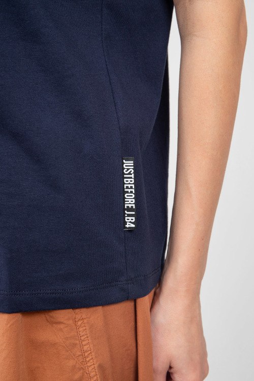Женская темно-синяя хлопковая футболка от J.B4 Just Before (Джаст Бифо). Принт на груди, круглый вырез горловины, короткий рукав, классическая длина.