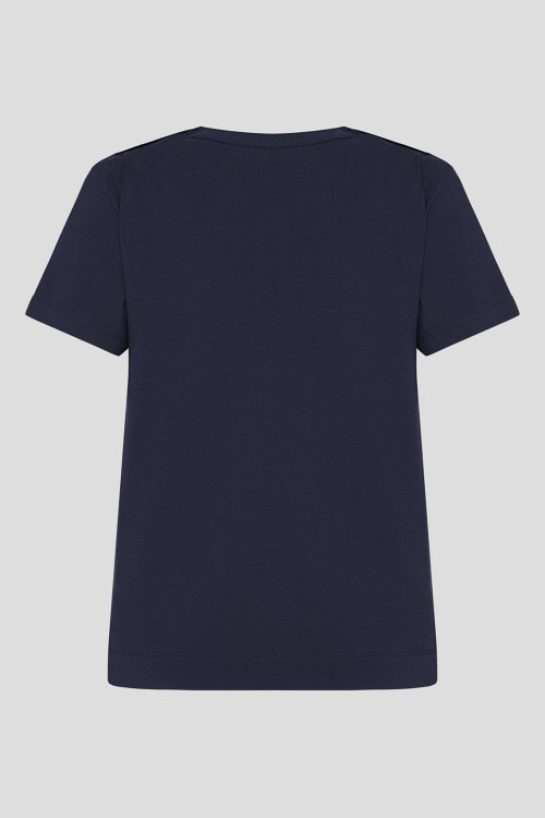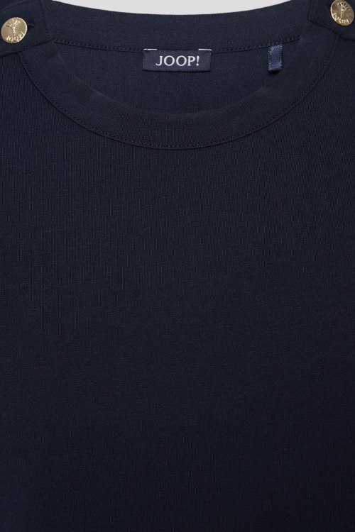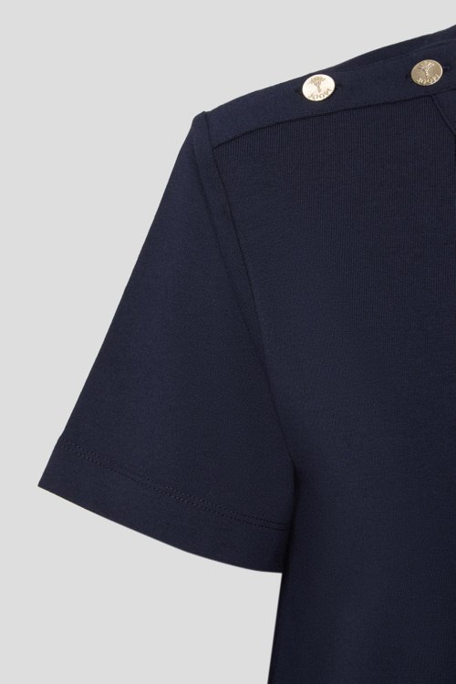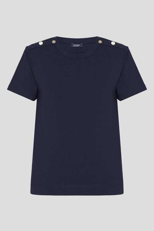 Детали: Женская темно-синяя хлопковая футболка от Joop! (Йооп!). Золотистые пуговицы на плечах, круглый вырез горловины, короткий рукав, классическая длина. Длина рукава: короткий, для размера 34 - 18,5 см, обхват груди: для размера 34 - 94 см, обхват талии: для размера 34 - 94 см, длина изделия по среднему шву спинки от горловины: для размера 34 - 57 см