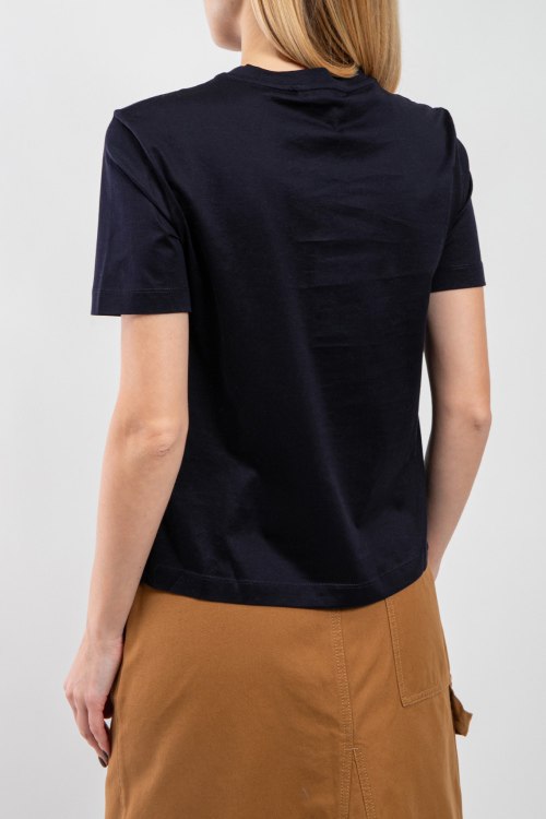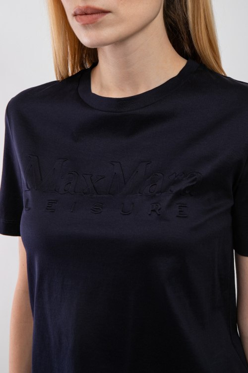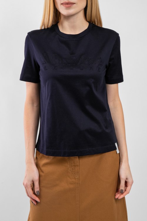 Женская темно-синяя футболка из хлопка от Max Mara Leisure (Макс Мара Лэжэ). Классическая длина, круглый вырез горловины, короткие рукава, модель декорирована тиснение с логотипом бренда на груди.