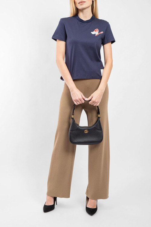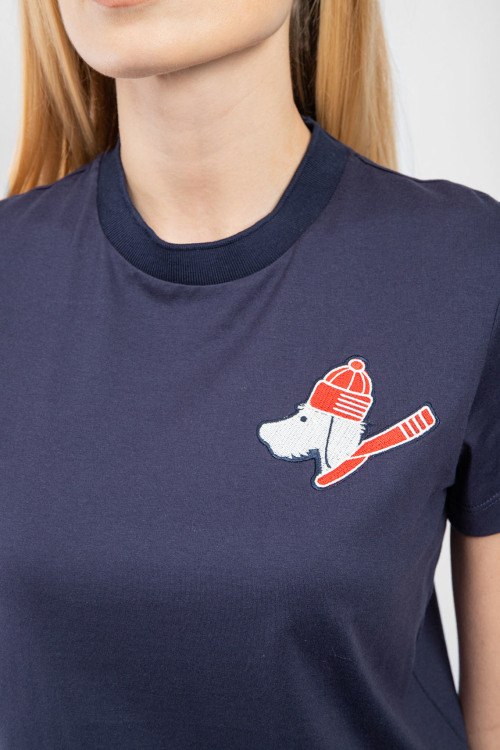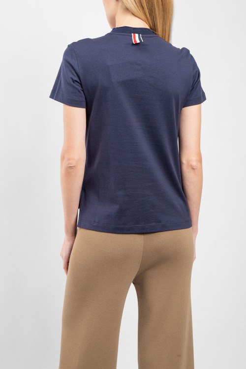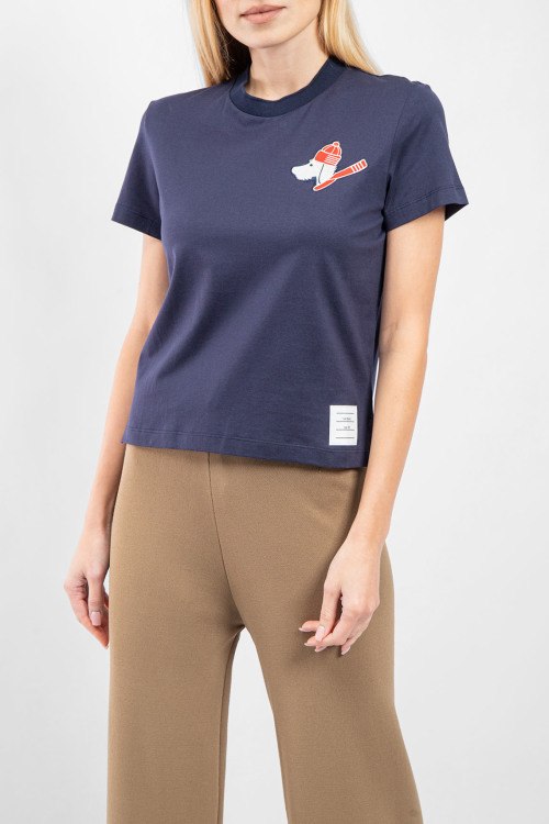 Детали: Женская темно-синяя хлопковая футболка от Thom Browne (Том Браун). Нашивка таксы на груди, круглый вырез горловины, короткий рукав, классическая длина