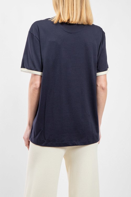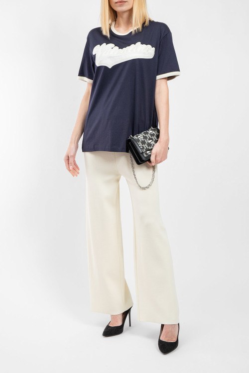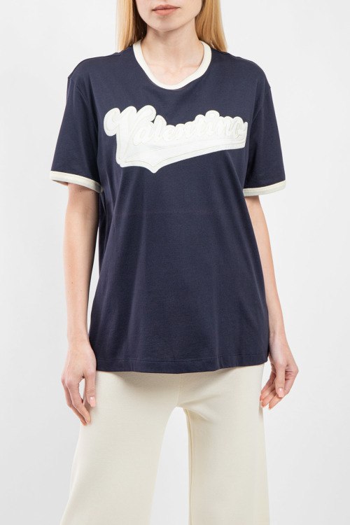 Женская темно-синяя футболка из хлопка от Valentino (Валентино). Удлиненная модель, круглый вырез горловины, короткие рукава, контрастная окантовка, брендированная нашивка на груди. Замеры для размера на фото: M; длина - 68,5 см; ПОГ - 56 см; ПОТ - 54 см; ПОБ - 54 см; длина по внутреннему шву рукава - 8,5 см; ширина рукава - 19 см.