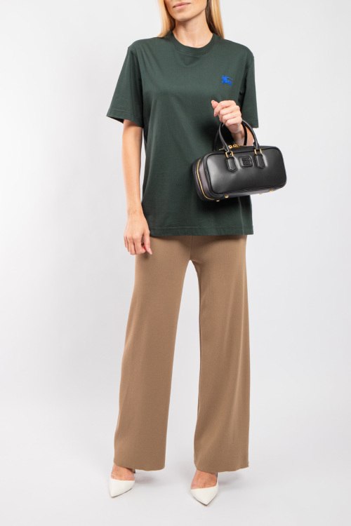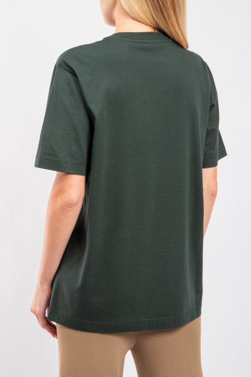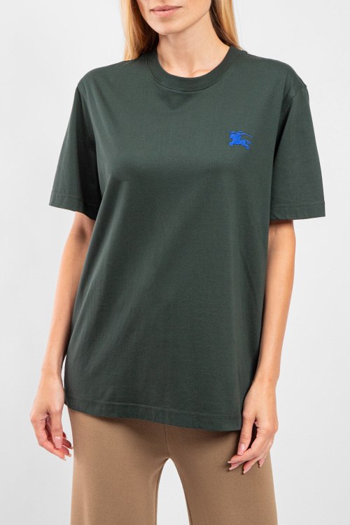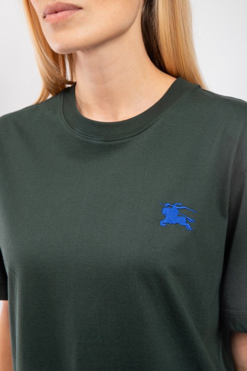 Женская темно-зеленая хлопковая футболка от Burberry (Бёрберри). Брендовая вышивка EKD на груди, круглый вырез горловины, короткий рукав, классическая длина.