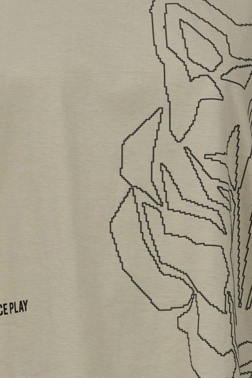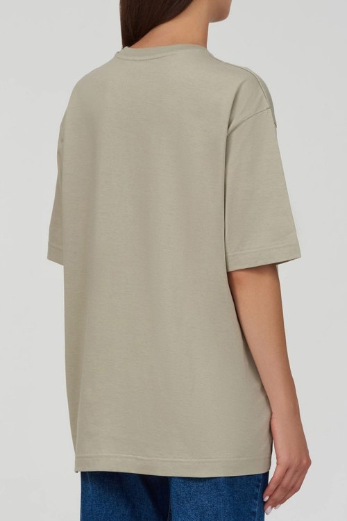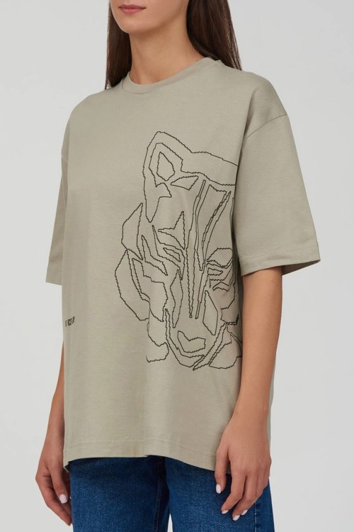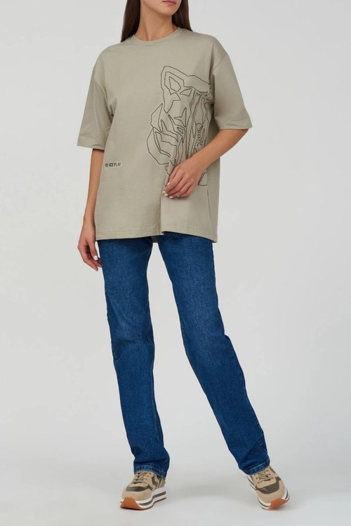Детали: Женская оливковая хлопковая футболка от Ice Play (Айс Плей). Принт на груди, круглый вырез горловины, короткий рукав, удлиненная длина