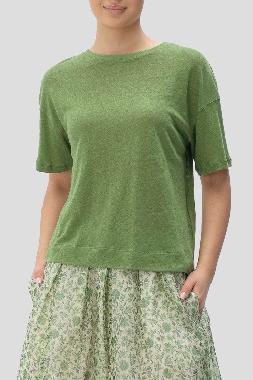 Детали: Женская зеленая футболка Barса из льна от Max Mara Weekend (Макс Мара Викенд). Классическая длина, круглый вырез горловины, короткие рукава, вышитый логотип бренда