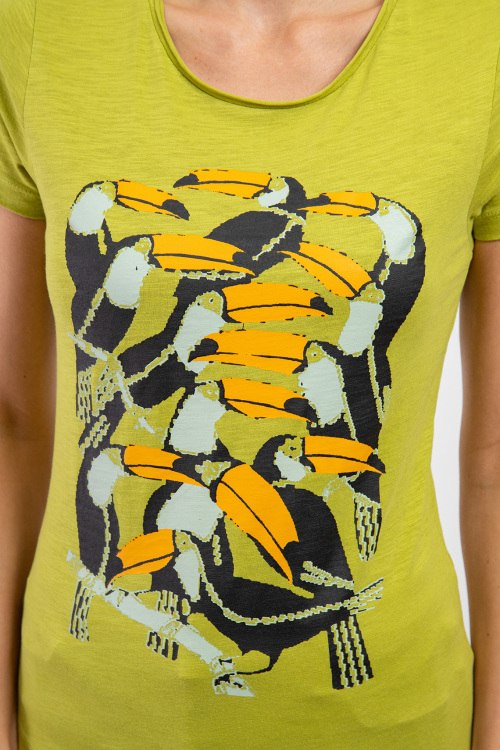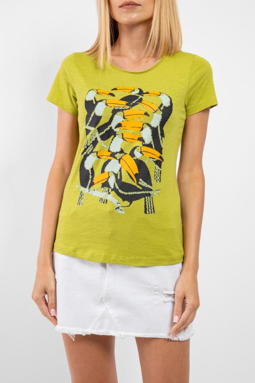 Женская светло-зеленая хлопковая футболка от Trussardi (Труссарди). Яркий принт спереди, круглый вырез горловины, короткий рукав, классическая длина.