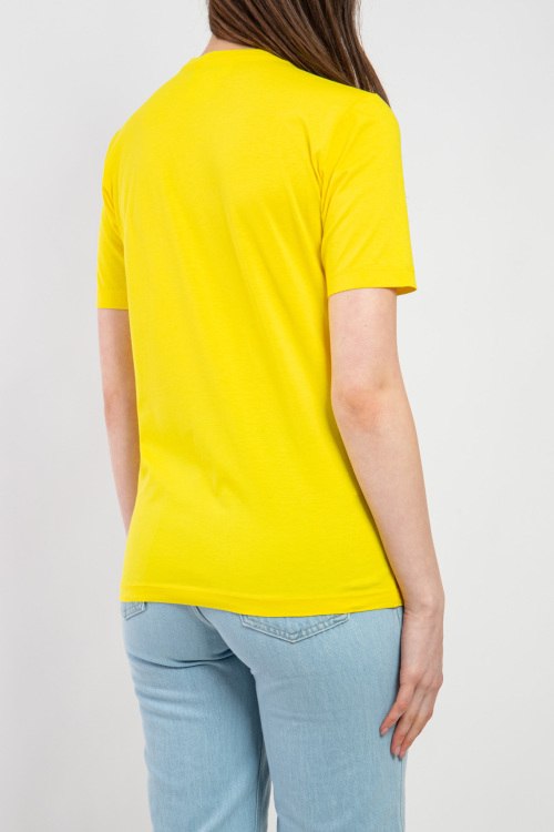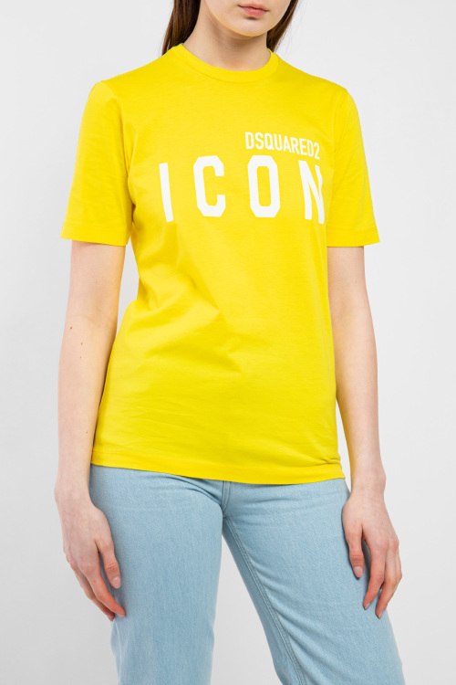Детали: Женская желтая хлопковая футболка ICON от Dsquared2 (Дискваред). Принт с логотипом спереди, круглый вырез горловины, короткий рукав, классическая длина