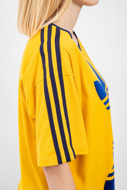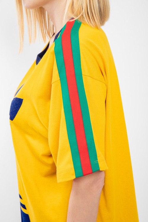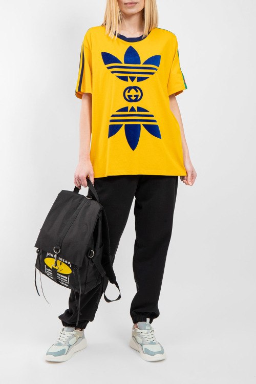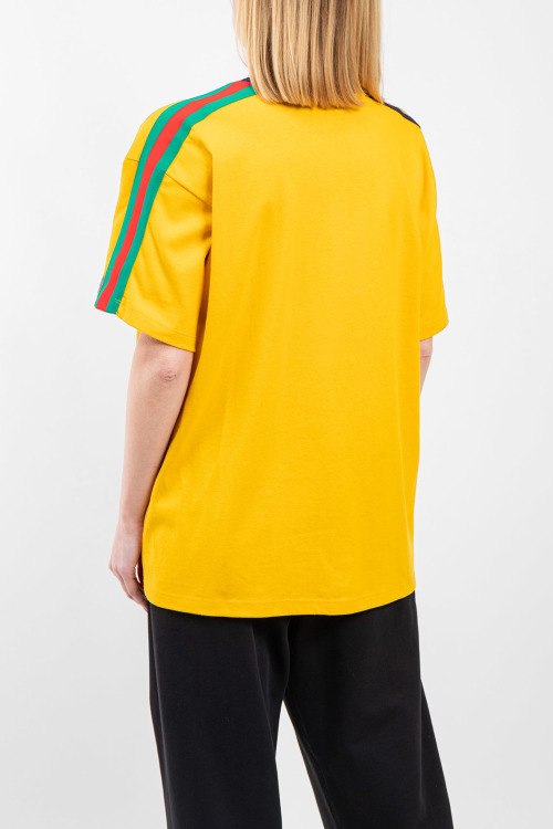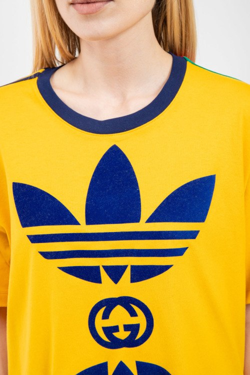Женская желтая хлопковая футболка Gucci х Adidas от Gucci (Гуччи). Логотип на груди, фасон oversize, круглый вырез горловины, короткий рукав с полоской Web, удлиненная длина.