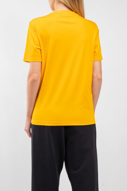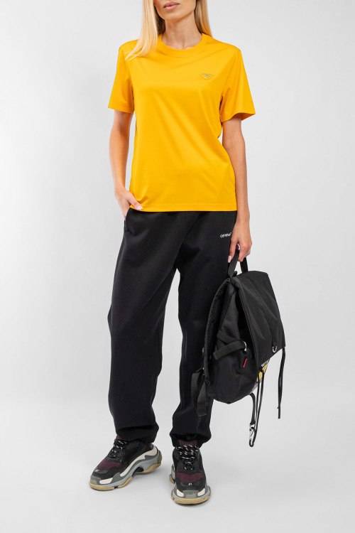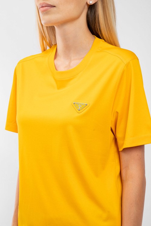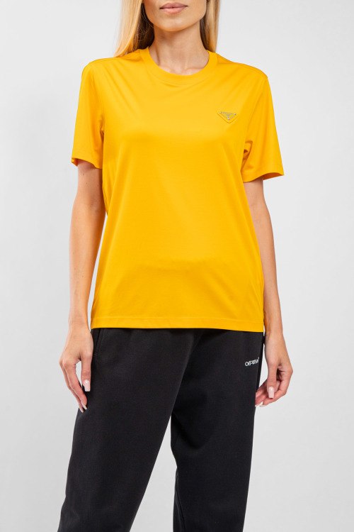 Женская желтая хлопковая футболка от Prada (Прада). Логотип на груди, круглый вырез горловины, короткий рукав, классическая длина.