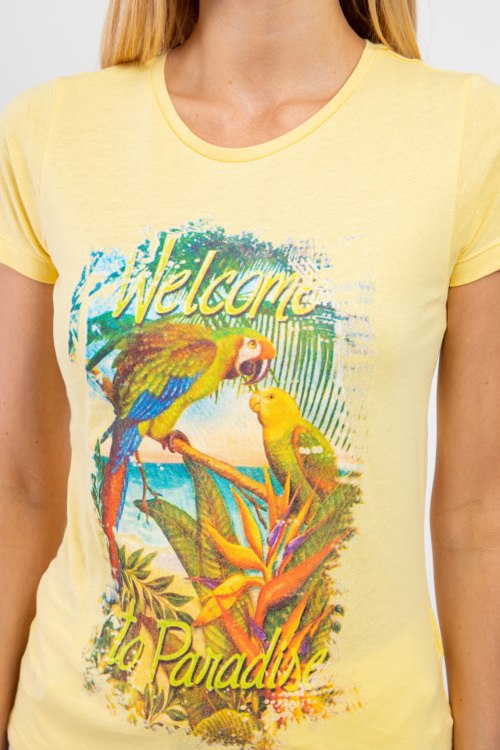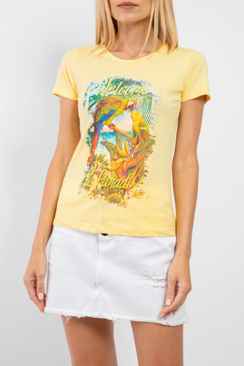 Женская желтая хлопковая футболка от Trussardi (Труссарди). Яркий принт спереди, круглый вырез горловины, короткий рукав, классическая длина.
