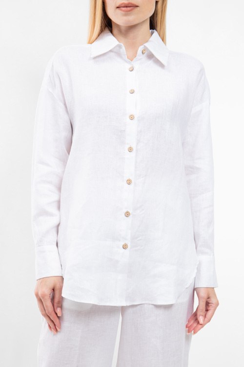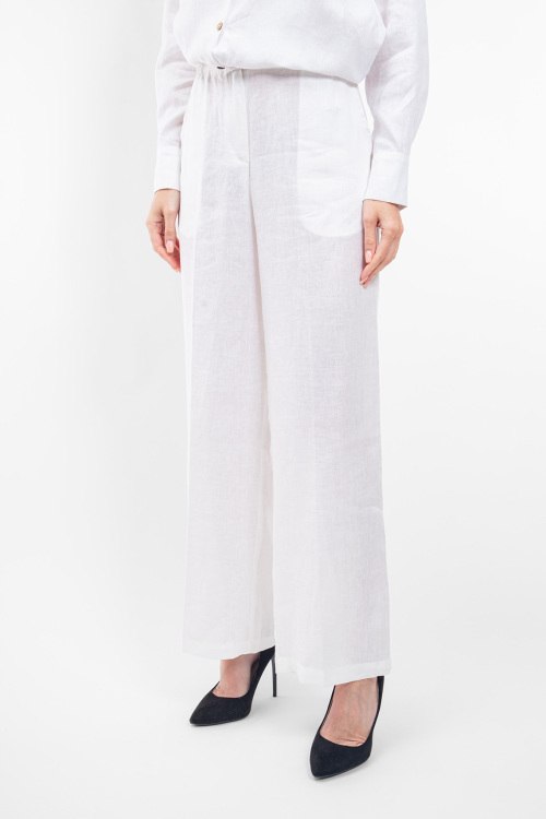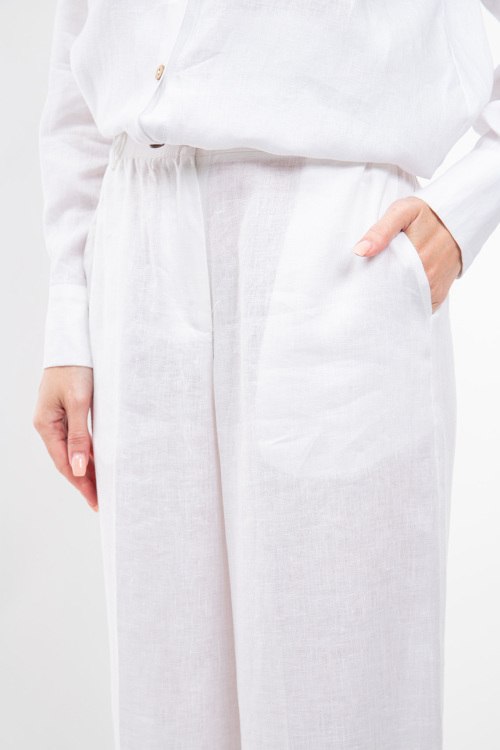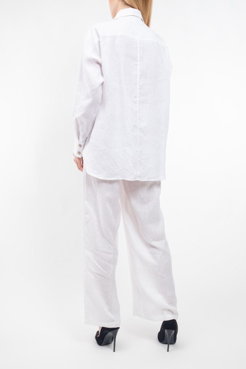 Женский белый льняной брючный костюм от Clothe (Клозе). Рубашка: отложной воротник, застежка на пуговицы, манжеты на пуговицах, удлиненная длина. Брюки: дизайн со стрелками, боковые карманы, пояс с петлями для ремня, широкий крой, полная длина. Размер вещи на фото: M. Рубашка: длина: 74 см, ширина по груди: 63 см, ширина по талии 65 см, ширина по бедрам 67 см, длина рукава: 46 см, ширина рукава 22 см. Брюки: длина: 106 см, ширина штанины вверху 33,5 см, высота сидения 37 см, ширина по поясу (резинка) 34 см, ширина по бедрам 51 см.