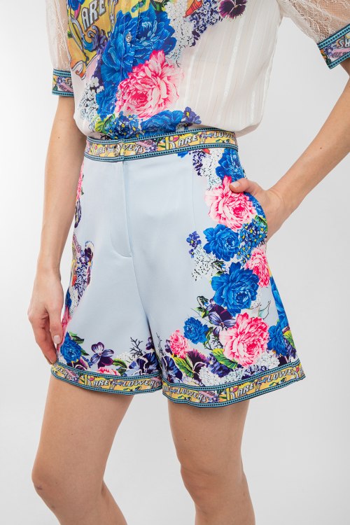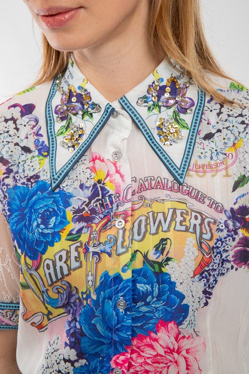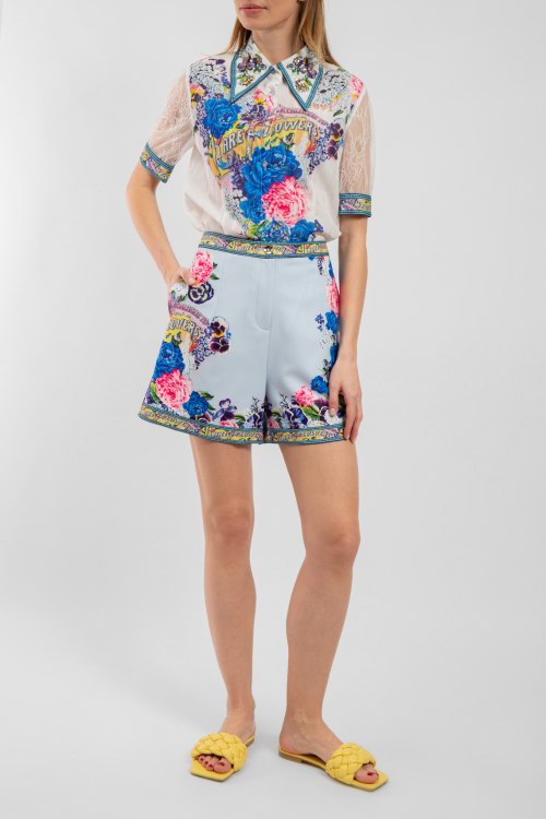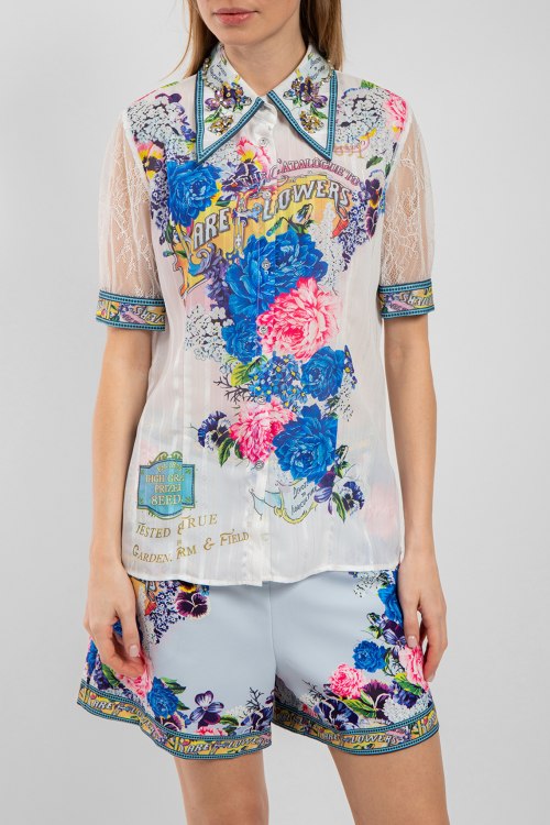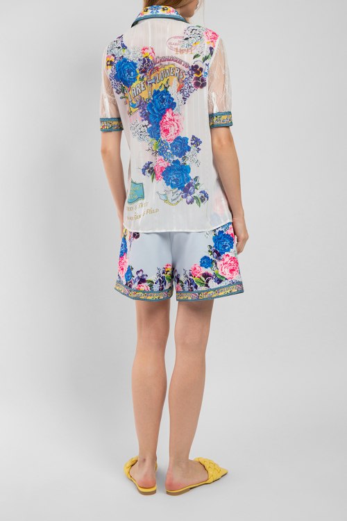 Женский белый костюм из хлопкового микса от Buby S (Баби Эс). Рубашка с коротким рукавом, застежка на пуговицы, отложной заостренный воротник декорирован бисером и пайетками, по всей поверхности изделия цветочный принт, короткие шорты с высокой посадкой, застежка на молнию, прорезные боковые карманы. Замеры для размера M: замеры рубашки: длина: 67 см, ширина по груди: 48,5 см, ширина по талии : 48,5 см, длина рукава: 11 см, ширина: 13,5 см, . Шорты: вшитая подкладка. замеры шорт: длина 43 см, ширина по поясу 38 см, ширина по бедрам: 46 см, высота сидения: 38 см, ширина штанины : 33 см.