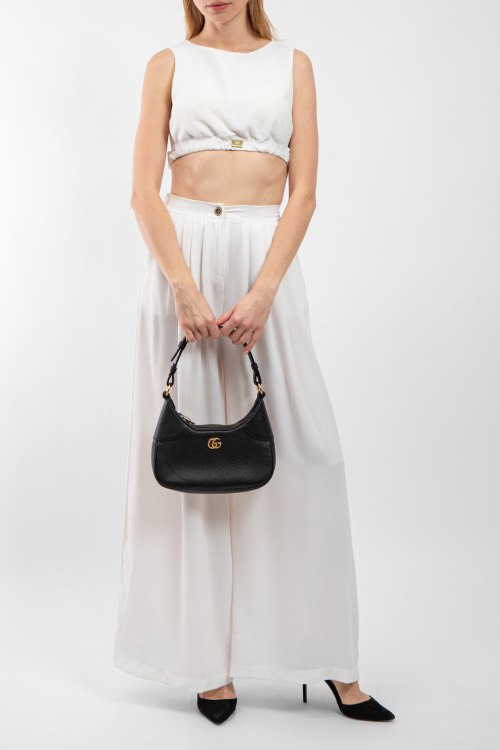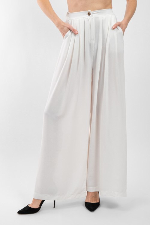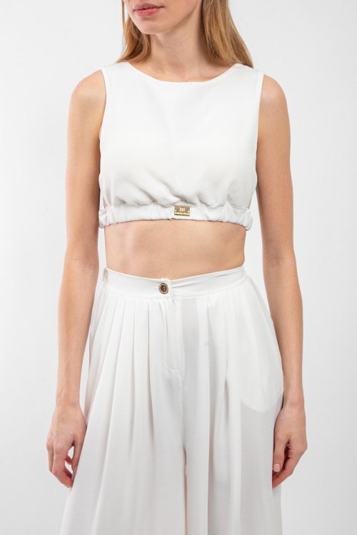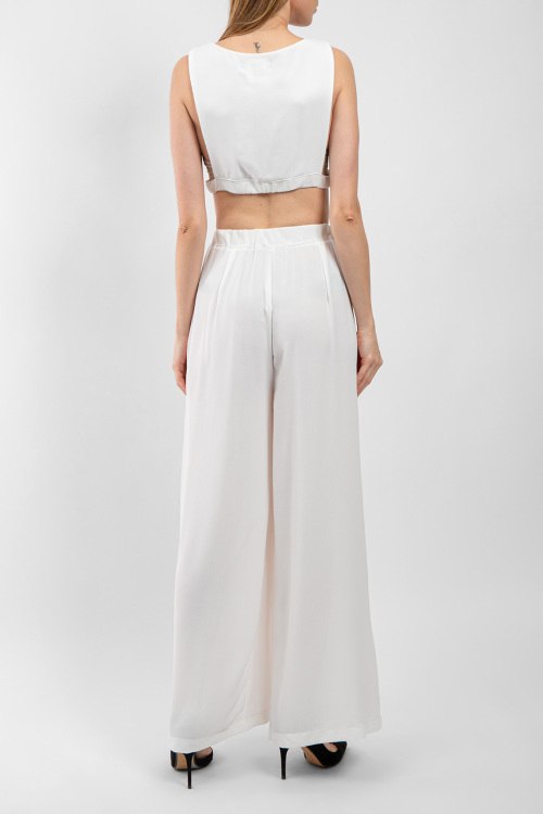 Женский белый костюм из вискозы от Roberta Biagi (Роберта Бьяджи). Кроп-топ: модель без рукавов, круглый вырез горловины, эластичная резинка с металлической нашивкой, короткая длина. Брюки: завышенная посадка, боковые карманы, широкий крой, полная длина. Замеры для размера UNI: длина: 107 см, ширина по поясу (резинка): 31 см, ширина по бёдрам: 39 см, ширина штанины сверху: 39 см.