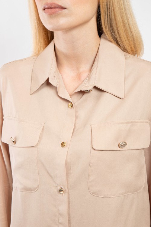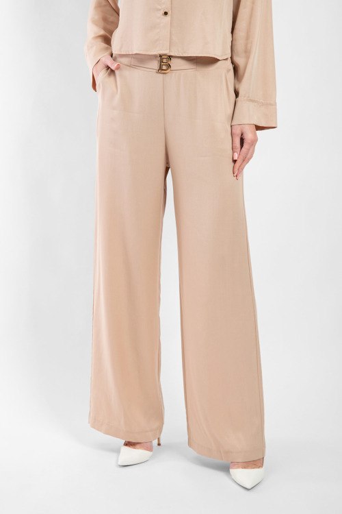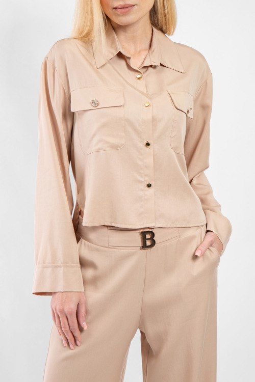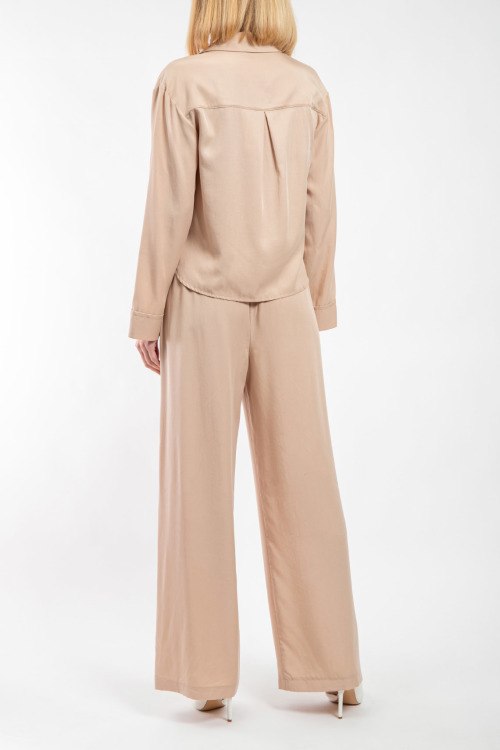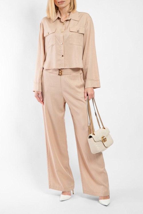 Женский бежевый костюм из лиоцелла от Barbara Alvisi (Барбара Алвиси). Рубашка с отложным воротником, застежка на золотистые пуговицы, длинные рукава, фигурный низ изделия, удлиненная модель по спинке, нагрудные карманы с клапаном, брюки палаццо классической длины, высокая посадка, прорезные карманы. Замеры для размера 42: длина блузы: 52 см, ширина по груди: 50 см, ширина по талии: 50 см, длина рукава по внутреннему шву: 46 см, ширина рукава: 19 см, длина брюк: 109 см, ширина по поясу: 39 см, ширина по бедрам: 48 см, высота сидения: 36 см, ширина штанины вверху: 32 см.