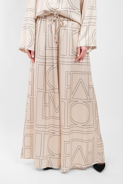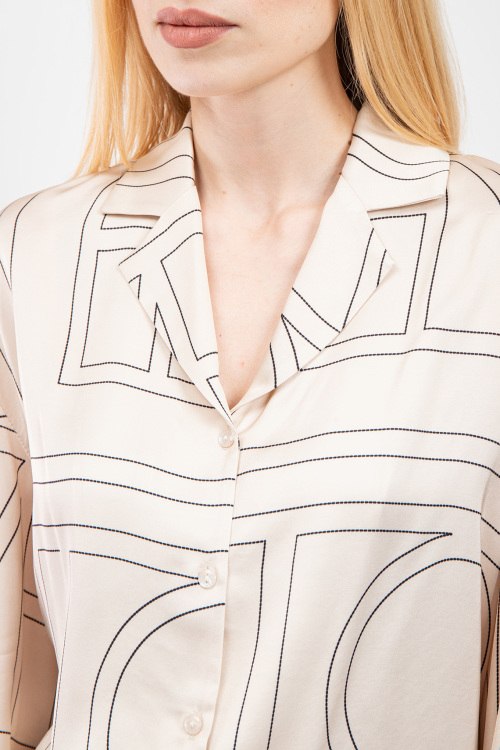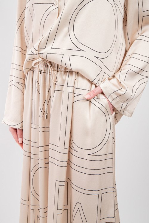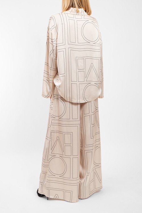 Женский бежевый костюм из вискозы от Clothe (Клозе). Дизайн с узором, рубащка на пуговицах, отложной воротник, длинные рукава, классическая длина, свободный крой, эластичная резинка на поясе. Замеры для размера L: рубашка: длина: 72 см, ширина по груди 61 см, ширина по талии 63 см, ширина по бедрам 64 см, длина рукава 43 см, ширина рукава 20 см, Брюки: длина: 112 см, ширина штанины вверху 41 см, высота сидения 38 см, ширина по поясу (резинка) 38 см, ширина по бедрам 52 см.